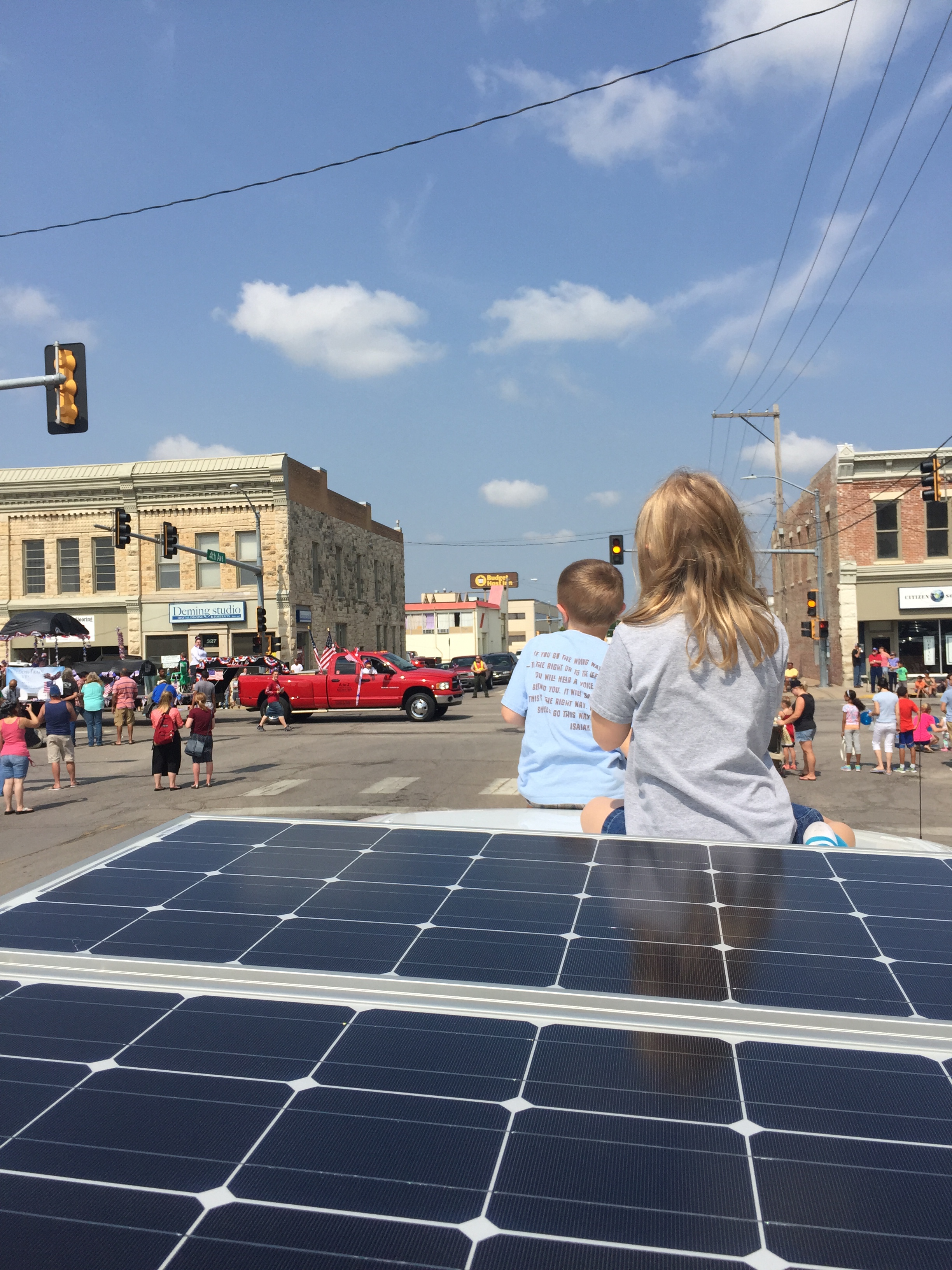 Plan to go to Kansas Cosmosphere & Space Center but decide since we’re behind we’ll push through to make it to the Sternberg Museum. As we’re heading out of Hutchinson we get stopped by the Main Street 4th of July parade. We enjoy the random “floats”, tractors, horses, and anything else that can be driven in small town Kansas going by. Candy and Popsicles aplenty. The older kiddos actually sit on hood to watch.