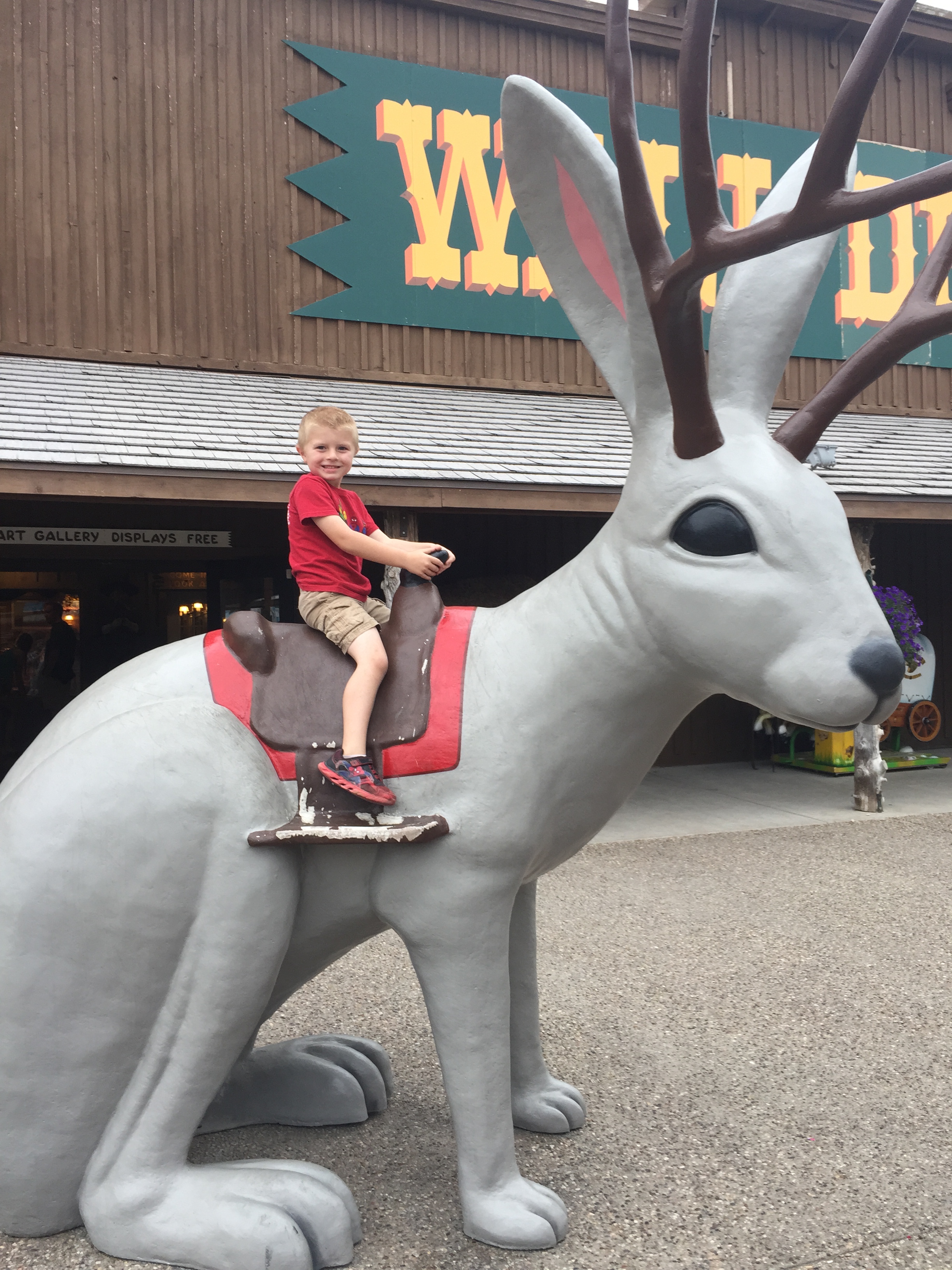 west to Mount Rushmore and Yellowstone for generations, we stopped at Wall Drug. This might be the world’s stickiest tourist trap. It originally started off as a drug store and ended up growing to take up several city blocks to form this combination Indian Trading Post, Chuck E Cheese, Kitch Shop, and Fun Emporium for adults and kids to explore.The kids were particularly fond of the section with the singing gorilla and giant dinosaur.